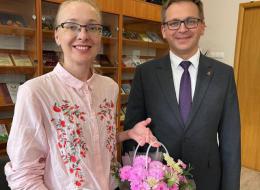 02.11.2025Председатель профсоюзной организации Сергей Азявчиков вручил цветы и подарок в денежном выражении Анне Ярошевич, старшему преподавателю социальной и педагогической психологии, за победу в республиканском профсоюзном конкурсе «Старт в новый учебный год»