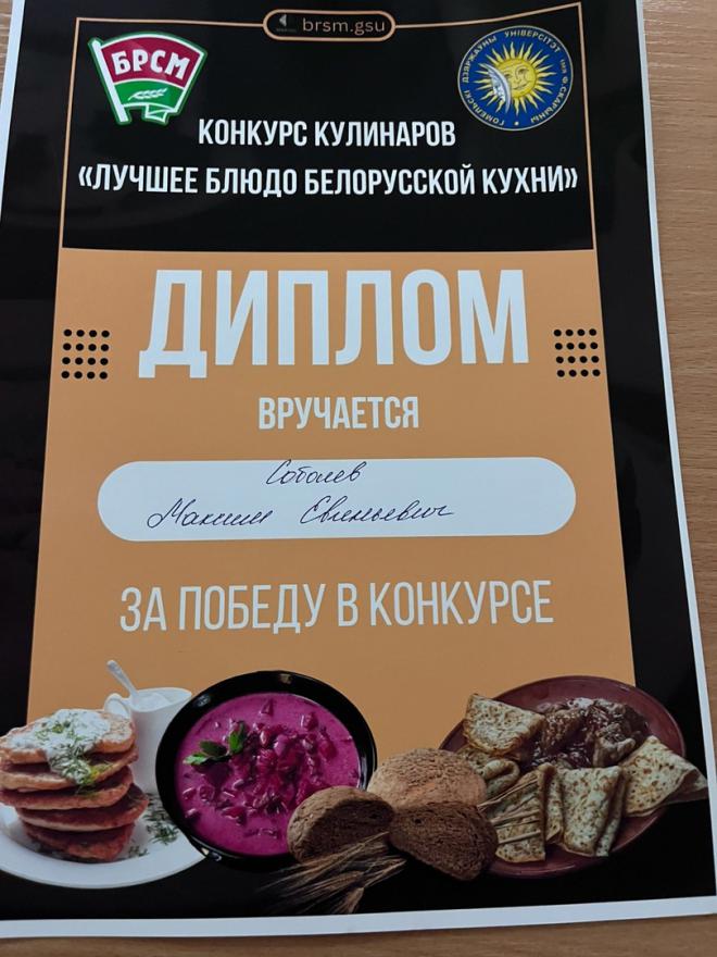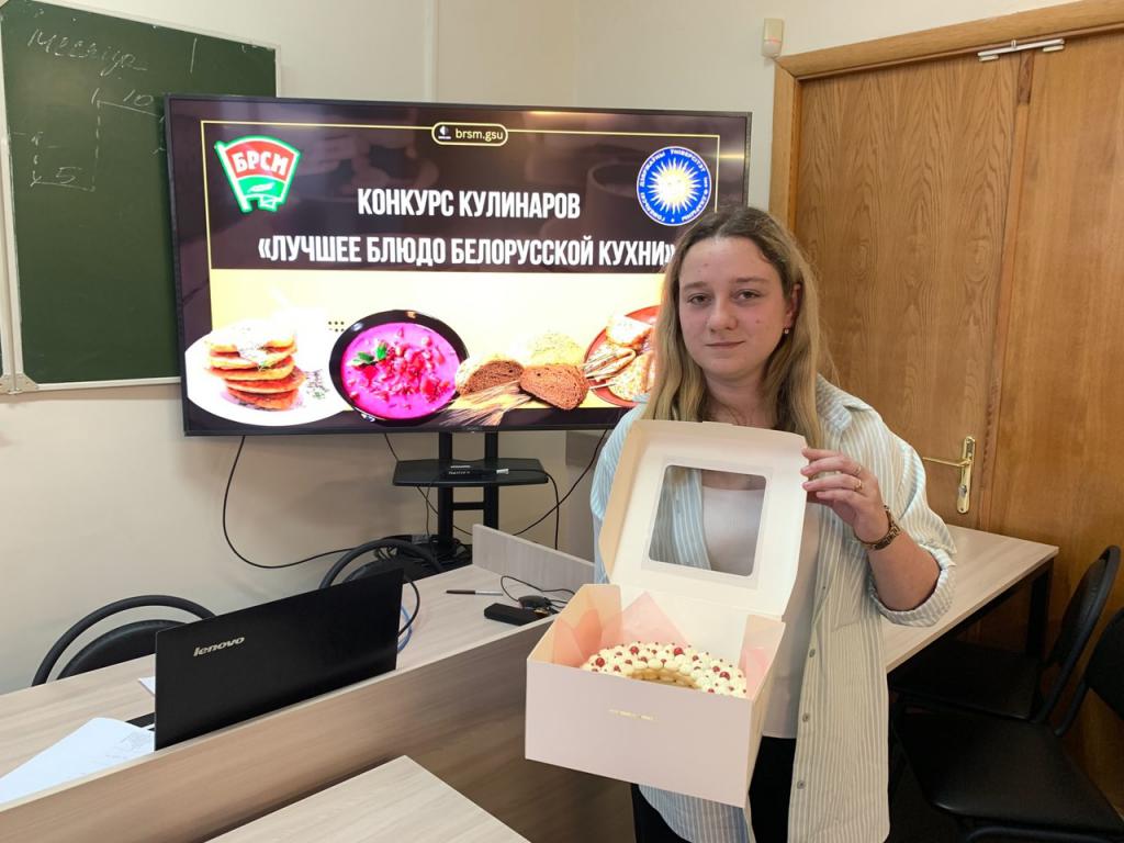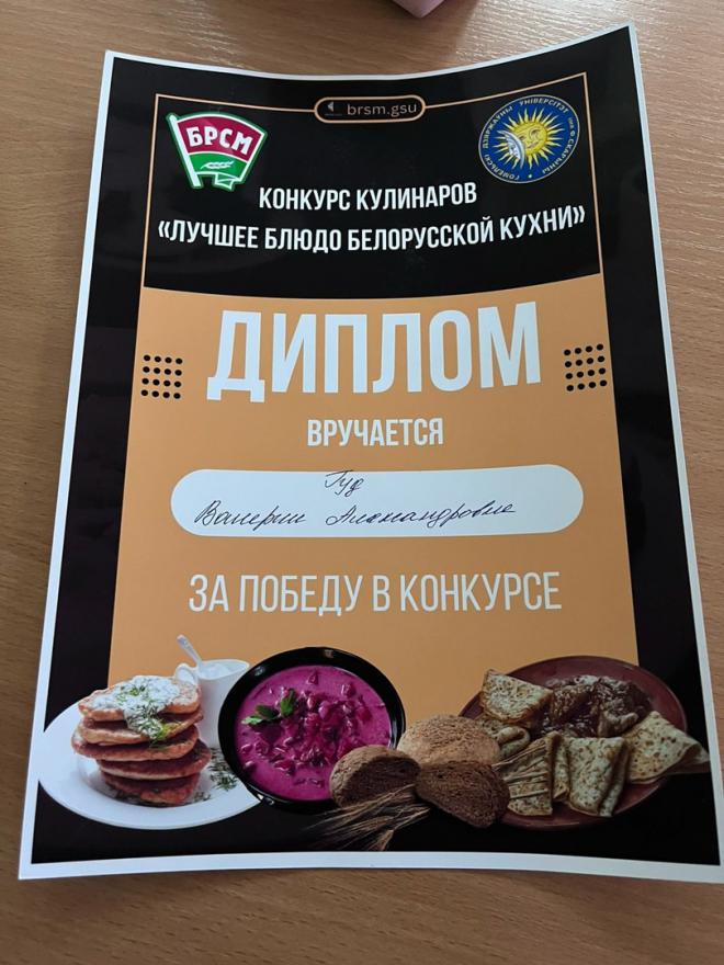 6 ноября 2024 года студенты факультета психологии и педагогики Соболев Максим, Гуд Валерия, Удовенко Дарья приняли участие в кулинарном конкурсе "Лучшее блюдо белорусской кухни". Конкурс прошел при содействии ПО ОО "БРСМ" университета. Победу одержала студентка группы СППО-21 Гуд Валерия. Поздравляем и желаем интересных рецептов и оригинальных блюд!