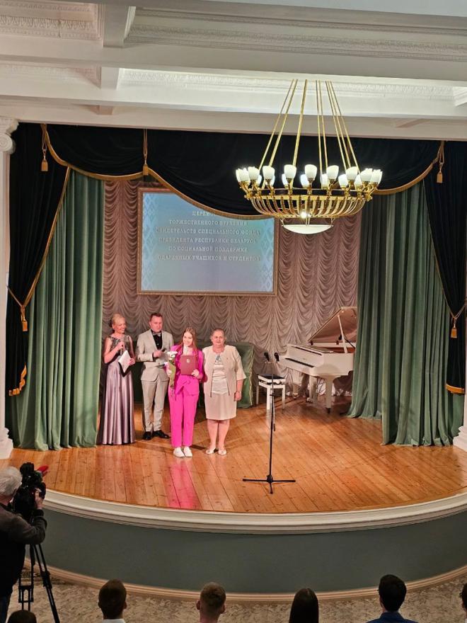 Поздравляем Анастасию Сергеевну Слесареву - лауреата республиканского конкурса научных работ студентов с получением заслуженной награды от Специального фонда Президента Республики Беларусь! Желаем новых научных и творческих достижений!