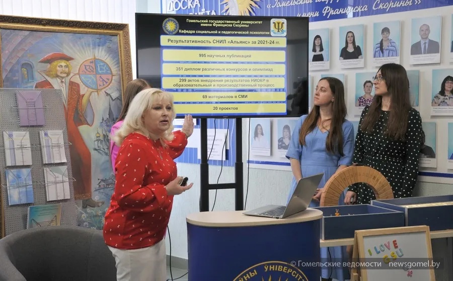Cтуденческая научно-исследовательских лаборатория «Альянс» (руководитель - зав. кафедрой социальной и педагогической психологии Татьяна Шатюк) представила свои достижения на выездном заседании совета спецфонда Президента по социальной поддержке одаренных учащихся и студентов, который прошел на базе ГГУ им. Ф. Скорины 22 апреля 2025 года.