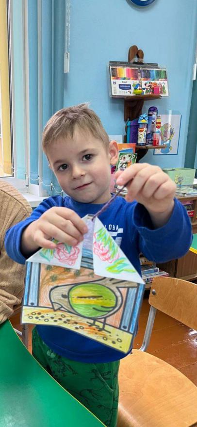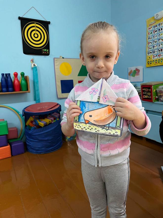 Каждый ребенок раскрасил птичку и ее домик, а потом мы вместе вырезали, согнули и соединили некоторые части. Дети были очень рады, что смогли сделать такую сложную для них поделку и старались показать ее всем.